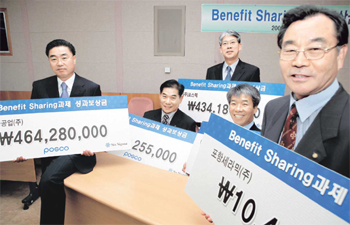 포스코의 ‘베네피트 셰어링(Benefit Sharing)’은 협력업체와 원가절감이나 품질 향상에 기여할 수 있는 방법을 개발하고, 성과가 나오면 협력업체에 보상하는 제도다. 지난해 6월 도입한 이후 적지 않은 성과가 나오고 있다.