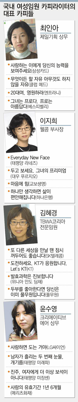 귀에 익은 이들 카피는 여성 카피라이터들의 펜에서 태어났다. 감성이 풍부한 여성 소비자들의 심리는 같은 여성이 잘 간파할 수 있기 때문이다.