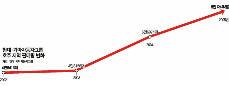 현대·기아차그룹은 지난해 현지에서 현대차 4만2510대, 기아차 2만4454대를 팔아 현대차는 시장 점유율 3위, 기아차는 6위에 올랐다. 이 그룹의 올해 호주 수출은 8만 대 정도로 추정된다.