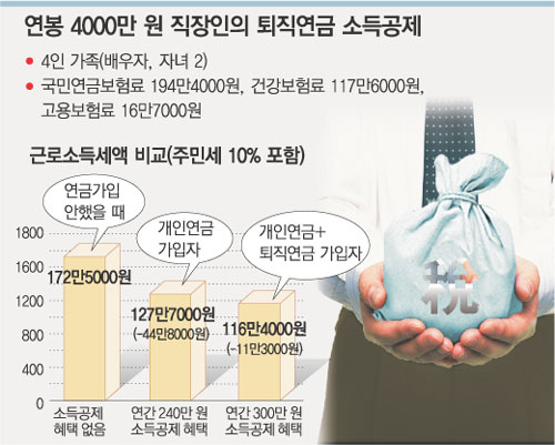 퇴직연금 세제 개편안에 따르면 근로자의 퇴직연금 추가 납입분에 대한 소득공제 혜택은 연간 300만 원. 여기엔 개인연금 가입자에 대한 소득공제 혜택 240만 원이 포함돼 있다.