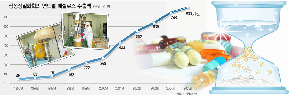 현재 삼성정밀화학의 메셀로스 생산능력은 연 1만5000t 규모. 올해 예상매출액은 800억 원 정도로 세계시장 전체규모는 약 1조 원에 이른다.