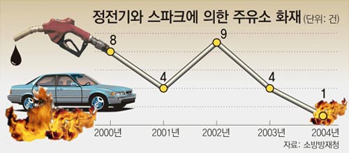 ▽화재 가능성은 얼마?=지난해 전국 주유소 1만2000여 곳에서 정전기 또는 스파크에 의해 일어난 화재는 단 1건. 최근 5년간 가장 많이 발생한 2002년에도 9건에 불과하다. 올해는 0건.