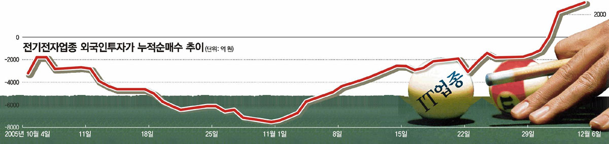 올해 주가가 상대적으로 덜 올랐던 IT 업종이 최근 외국인투자가의 적극적인 매수에 힘입어 증시의 주도주로 떠오르고 있는 것.