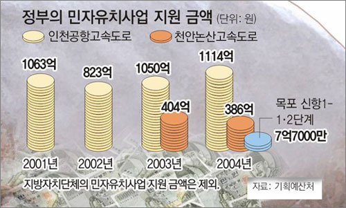 사업규모가 가장 큰 인천공항고속도로는 개통 이후 4년간 4050억 원이 지원됐으며 올해도 1200억 원가량이 국고에서 빠져나갈 것으로 보인다. 이런 추세라면 2020년까지의 재정 지원이 1조6000억 원에 이르러 수입보장금이 도로 건설비용(1조3346억 원)을 넘어설 전망이다.