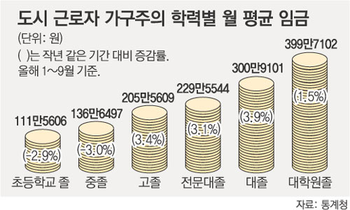 학력별로는 대학원 졸업자가 작년보다 1.5% 늘어난 399만7102원, 대졸자는 300만9101원(3.9% 증가), 고졸자는 205만5609원(3.4% 증가)이었다.