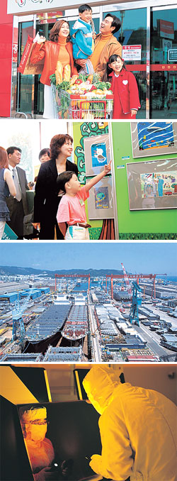 ![]() 2005 한국경영대상 수상 기업들은 우선 비전과 목표를 세우고 이를 지속적인 혁신으로 실천한 끝에 해당 업계의 유력 주자로 부상할 수 있었다. 위로부터 삼성테스코 하나은행 현대중공업 LG마이크론. 사진제공 각 기업 |