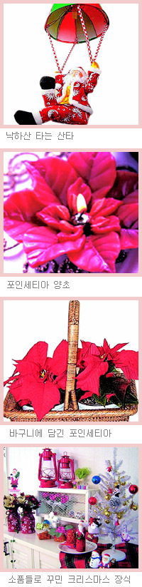 대표적인 장식품은 ‘리스’. 솔잎이나 포인세티아로 화환처럼 만들어 현관문이나 방문, 벽에 걸어 두는 장식품이다. 붉은색의 포인세티아로 만든 리스는 화사한 분위기를, 솔잎으로 만든 제품은 차분한 분위기를 낸다.