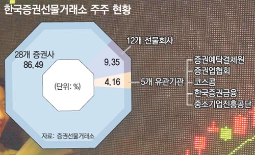 증권선물거래소는 정부 지분이 전혀 없고 정부 예산을 한 푼도 받지 않는 100% 순수 사(私)기업. 증권회사와 선물회사 등이 지분을 갖고 있다.