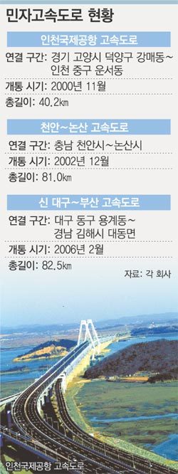 건교부는 이에 대해 “1998년 외환위기 직후 자금 조달이 어려운 점을 감안해 그동안 국고에서 민자사업자의 운영 수입 손실을 일부 보전해 줬다”며 “앞으로 이를 줄인다는 게 정부 방침인 만큼 운영사업자들의 수입 증대를 위한 다양한 노력은 계속될 것”이라고 전망했다.