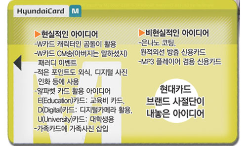 실제로 사절단은 현대카드 중 하나인 W카드의 CM송(‘아버지는 말하셨지’)이 화제를 모으고 있는 데 착안해 W카드 CM송 패러디 이벤트를 제안했고 현대카드는 이를 실행에 옮겼다. W카드 광고에 나오는 곰돌이도 마케팅에 활용하면 어떻겠느냐는 제안에 현대카드는 곰돌이 마스크를 제작해 현장 이벤트에 적극 활용할 예정이다.