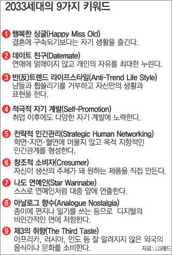 광고대행사 LG애드는 4개월 동안 트렌드 리더 심층 인터뷰, 텍스트 분석, 현장 관찰 등을 통해 작성한 보고서 ‘소비자의 중심 2033세대의 신(新)트렌드 키워드 9’을 18일 발표했다.