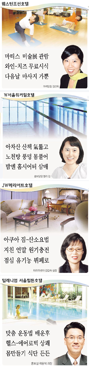 다음 날 오전 7시 사우나를 하고 1층 라운지에서 뷔페식사. 오전 9∼10시에는 피트니스 센터에서 체력 점검을 받고 전문 트레이너에게 맞춤 운동 방법을 소개 받는다. 낮 12시경 체크아웃을 하기 전에 피트니스 센터에서 마사지로 마무리한다.(마케팅팀 김선희)