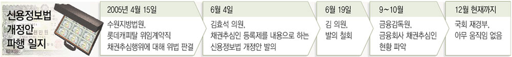 등록제를 도입하면 빚 독촉이 강화될 것이라고 생각한 채무자들의 반발이었다. 발의 보름 뒤인 6월 19일 김 의원은 결국 이를 철회하고 말았다. 이후 6개월이 지났다. 하지만 국회나 재정경제부에서는 아무런 움직임이 없다. ]