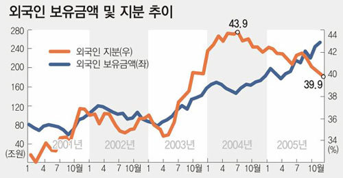 외국인 비중은 2003년 5월 말부터 급상승해 지난해 7월 말 43.9%까지 올랐다가 하락하는 추세다.