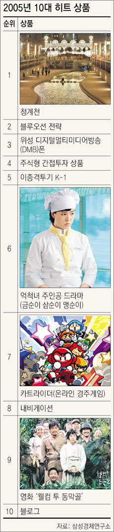 청계천에 이어 △블루오션(경쟁 없는 시장) 전략 △위성 디지털멀티미디어방송(DMB)폰 △주식형 간접투자 상품도 인기 상품으로 꼽혔다.
