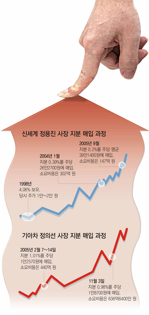오현석 삼성증권 연구원은 “올해 기아차 주가가 급등한 데는 정 사장의 지분 매입 효과가 가장 컸다”며 “앞으로 정 사장이 미래를 대비한 책임경영 차원에서 현대차 지분도 사들일 가능성이 있다”고 전망했다. 현재 정 사장은 주가가 9만5000원대인 현대차 주식을 전혀 보유하지 않고 있다.