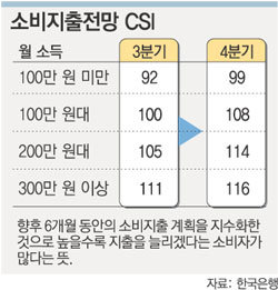 4분기 소비지출전망 CSI는 월 소득 100만 원 미만인 가구만 99로 기준치(100)를 밑돌았고 100만 원대 이상 가구는 모두 기준치를 웃돌았다. 월 소득 200만 원대와 300만 원 이상 가구의 소비지출전망 CSI는 각각 114, 116으로 나타났다.