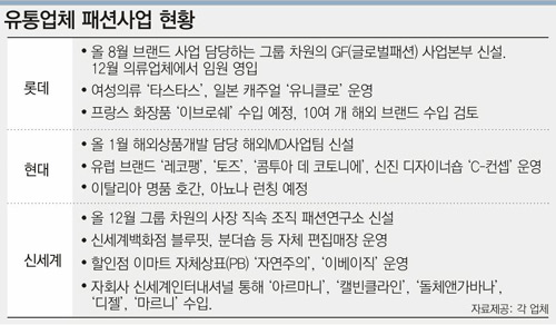 롯데도 올해 8월 흩어져 있던 패션 부문을 하나로 합쳐 ‘GF(글로벌패션) 사업본부’를 만들었다. 롯데의 새로운 성장동력 중 하나로, 패션을 강조하는 신동빈 부회장의 뜻이 반영된 것으로 알려졌다.
