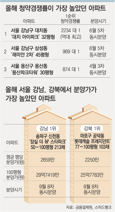 6월 분양된 서울 강남구 대치동 ‘대치 아이파크’ 32평형은 1가구 모집에 2234명이 몰렸고, 9월 분양된 서울 송파구 신천동 ‘잠실 더 (노,로) 스타파크’ 100평형은 올해 최고 분양가인 평당 2950만 원에 분양됐다.