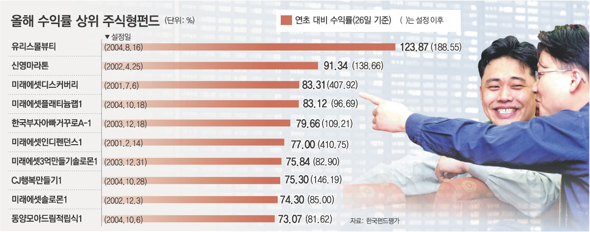 올해의 스타 펀드는 단연 ‘유리 스몰뷰티’다. 유리자산운용이 운용하는 이 펀드는 연초 대비 수익률이 123.87%로 주식형 펀드 가운데 수익률이 가장 높았다.