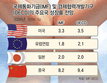 다만 연방준비위원회(FRB)의 금리 인상으로 그 동안 과열 양상을 보여 온 주택 경기가 얼마나 둔화될 것인가가 미국의 성장률에 큰 영향을 미칠 것으로 전문가들은 보고 있다. 2003년 이후 매년 9% 이상의 고도성장을 해온 중국 경제는 올해에도 8%대 성장을 할 전망이다. 투자와 수출 증가세가 둔화되고 있지만 ‘서부 대개발’ 등 초대형 개발사업이 계속되고 있으며 중산층이 두꺼워지면서 내수 기반이 탄탄해지고 있기 때문이다. ‘10년 장기불황’의 늪에서 탈출한 일본은 새해에는 디플레이션의 영향권에서 완전히 벗어날 것으로 보인다. 과잉채무, 과잉설비, 과잉인력 문제가 대부분 해소돼 올해 하반기(7∼12월) 성장률은 2%대 후반까지 높아질 것으로 예상된다.