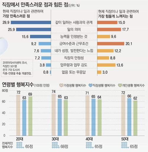 중견기업에 다니는 김모(38) 차장은 “양심에 어긋나는 일을 해야 할 때는 불행할 수밖에 없다”고 했고, 권모(34) 과장은 “그렇기 때문에 직업만으로 행복해질 순 없다”고 덧붙였다. 정보통신기업의 박모(36·여) 씨는 “퇴근하고 집에 들어가 아이가 자는 모습을 보고 있으면 모든 피로가 눈 녹듯 사라진다”고 말했다.