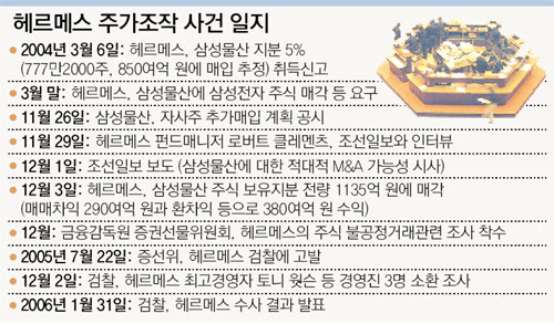 서울중앙지검 금융조사부(부장 정동민·鄭東敏)는 “영국계 투자법인 헤르메스의 전 펀드매니저 로버트 클레멘츠 씨가 언론 인터뷰를 이용해 삼성물산 주가를 띄운 뒤 보유 주식을 팔아 부당 이득을 챙긴 혐의가 인정돼 체포영장을 발부받아 기소 중지했다”고 밝혔다. 검찰에 따르면 헤르메스는 2004년 11월 29일 조선일보와의 인터뷰에서 삼성물산에 대한 적대적 인수합병(M&A)을 언급하고 이틀 뒤 이에 관한 기사가 보도돼 삼성물산 주가가 오르자 삼성물산 주식을 모두 팔아 치워 290여억 원의 시세 차익을 거둔 혐의다.