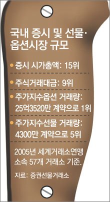 리슨 씨가 6000억 원을 날린 것도 ‘지렛대 효과’ 때문이었다. 그런데 한국의 주가지수선물 시장은 세계 5위, 옵션 시장은 세계 1위의 거래량을 자랑한다. 투자자들이 ‘대박’을 노려 선물과 옵션 시장에 몰리기 때문이다.
