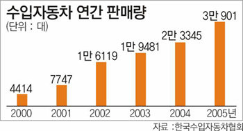 수입차 판매량은 2000년 4414대에서 2005년 3만901대로 빠른 속도로 늘고 있다.