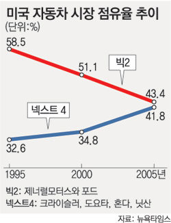 지난해 넥스트4의 미국 시장점유율은 합쳐서 42%로 빅2의 43%에 육박한다. 15년 전만 해도 빅2의 시장점유율은 넥스트4의 두 배에 이르렀다.