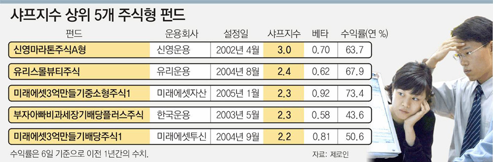 제로인에 따르면 1년 이상 운용된 설정액 100억 원 이상의 주식형 펀드 가운데 신영투신운용의 ‘신영마라톤주식A형’의 샤프지수가 3.0으로 가장 높았다.