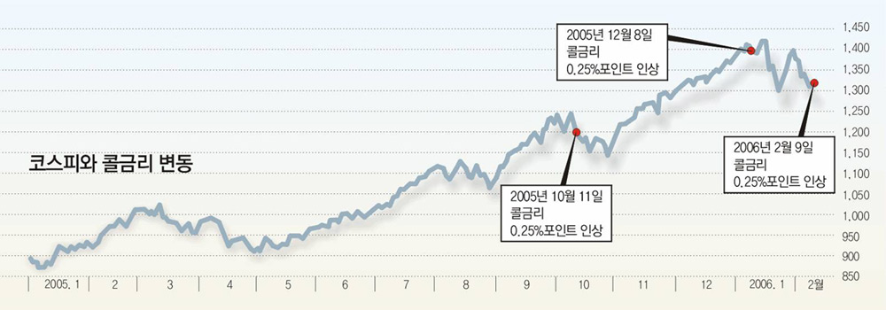 콜금리가 오르긴 했지만 여전히 실질 금리가 높지 않아 증시 자금이 채권이나 은행 예금 쪽으로 이탈할 가능성은 높지 않다는 분석이 많다.
