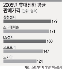 미국의 시장조사기관인 스트래티지 애널리틱스(SA)가 10일 발표한 ‘2005년 세계 휴대전화 시장점유율’ 자료에 따르면 삼성전자의 휴대전화 평균 판매 가격은 대당 179달러(약 17만9000원)로 가장 높았다.
