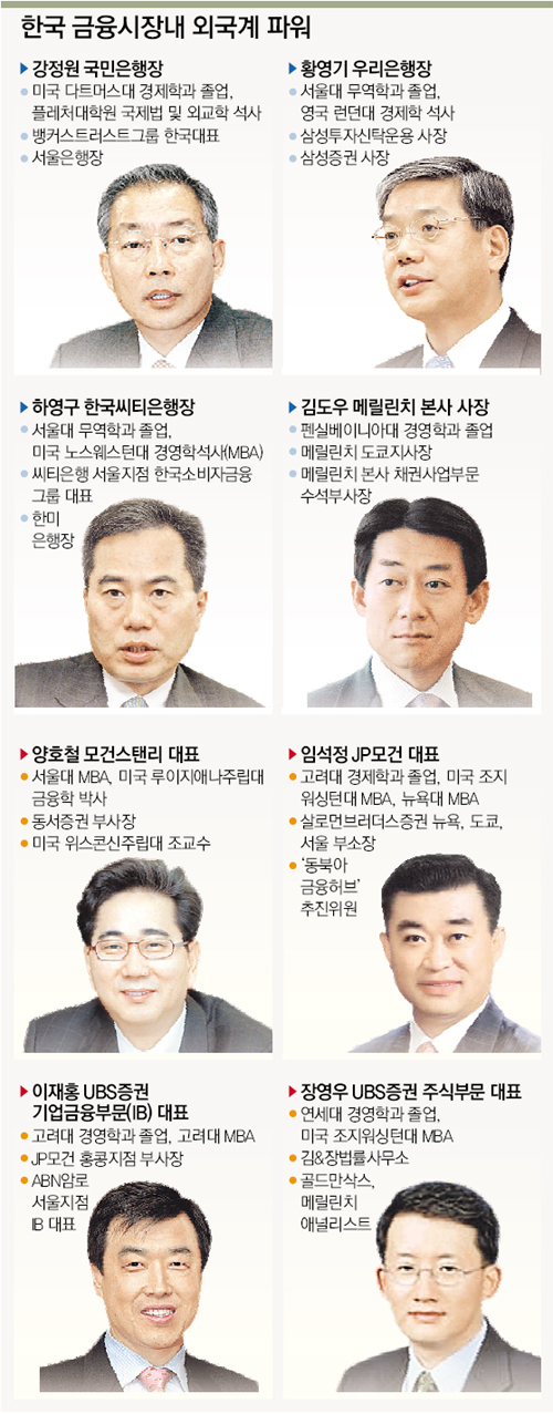 시중은행장 가운데 리처드 웨커 외환은행장, 존 필메리디스 SC제일은행장, 강정원(姜正元) 국민은행장, 황영기(黃永基) 우리은행장, 하영구(河永求) 한국씨티은행장, 최동수(崔東洙) 조흥은행장은 모두 외국계 출신이다.