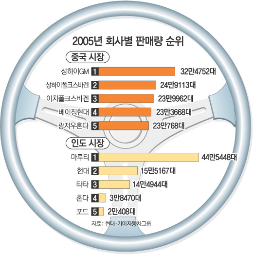현재 인도에서는 인도 ‘토종 기업’인 마루티가 자동차 시장의 절반을 차지한 가운데 현대차와 타타가 그 뒤를 따르고 있다. 현대차와 GM 외에도 도요타, 포드, 혼다, 볼보 등의 외국 기업이 시장 쟁탈전을 벌이는 상황이다.