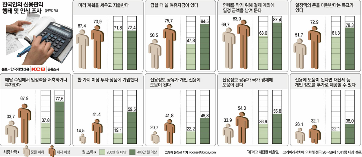본보가 개인신용평가 전문업체인 한국개인신용(KCB)과 공동으로 전국의 20∼59세 남녀 1011명을 대상으로 ‘금융 행태 및 신용에 대한 인식’을 조사한 결과 학력이나 소득에 따라 신용에 대한 인식 및 신용관리에 큰 차이가 있는 것으로 나타났다.