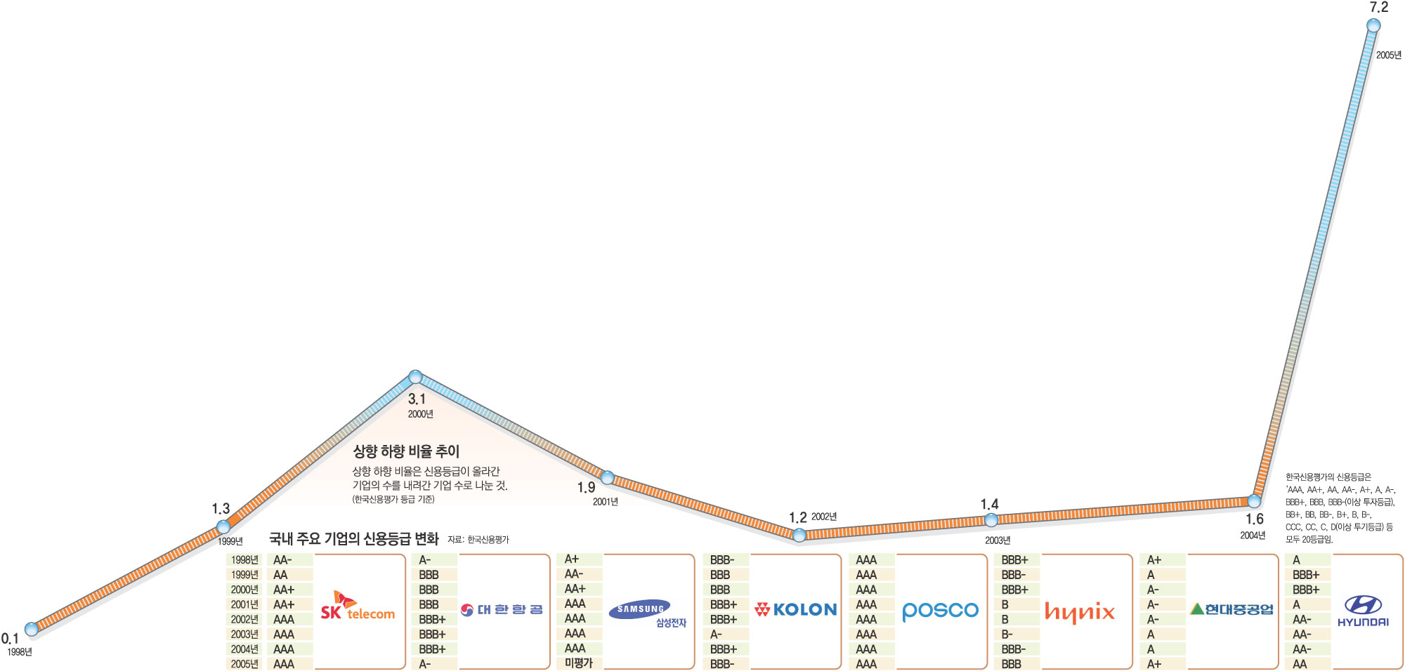 신용등급이 올라간 기업 수를 떨어진 기업 수로 나눈 ‘상향 하향 비율(up down ratio)’은 1998년 0.1이었다. 신용등급이 떨어진 기업이 10배나 많았다는 의미이다.