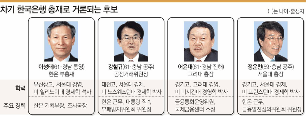 이 밖에 심훈 부산은행장, 정운찬 서울대 총장, 이정우 전 대통령자문 정책기획위원장, 박철 한은 고문, 박영철 서울대 국제통상금융센터 소장 등도 한은 총재 후보로 거론된다.