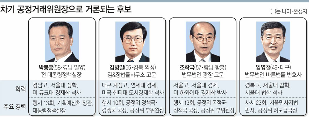 새 공정위원장 후보로는 최근 들어 기획예산처 장관 출신인 박봉흠 전 대통령정책실장의 기용설이 많이 나온다.