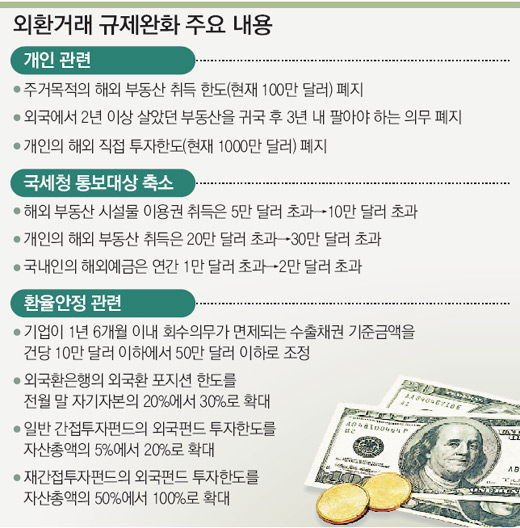이번 대책은 달러당 원화 환율 하락(원화 가치 상승)이 급격하게 진행되는 것을 막기 위한 정책적 판단이 깔려 있다. 정부는 외환시장에서 직접 달러를 사들여 환율을 방어하기보다는 개인과 기업의 해외 투자를 촉진해 만성적인 달러화 초과 공급을 줄이는 쪽으로 방향을 돌리고 있다. 특히 개인 생활과 관련이 깊은 주요 내용을 문답(Q&A)으로 알아 본다.