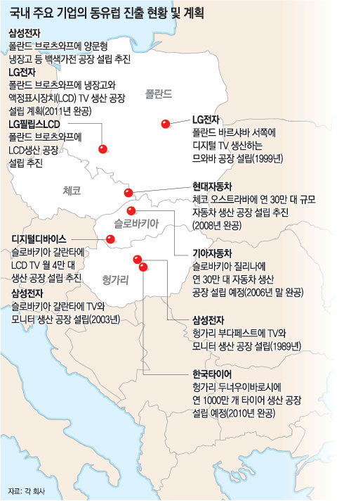 한국의 수출 주력 제품인 전자와 자동차 제조업체들이 이처럼 동유럽을 생산의 전초기지로 활용하는 것은 인건비와 물류비가 저렴한 데다 지리적으로 가까운 서유럽 시장 공략에 유리하기 때문이다.
