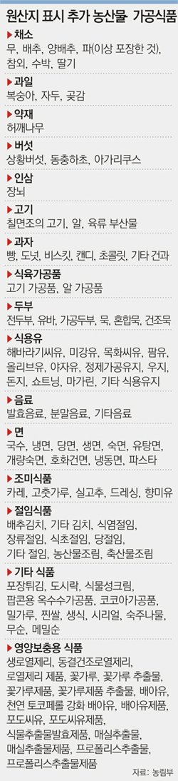 원산지 의무표시 대상에 새로 포함된 농산물은 배추, 무, 양배추, 파, 참외, 수박, 딸기, 복숭아, 자두, 곶감, 상황버섯, 아가리쿠스, 동충하초, 장뇌, 프로폴리스 등 15개.