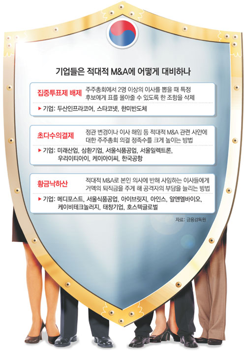 기업들도 자구책 마련에 나섰다. 금융감독원에 따르면 두산인프라코어 한미반도체 스타코넷 등은 ‘집중투표제 배제’를 올해 주주총회 정식 안건으로 잡았다. 집중투표제는 소액주주들의 투표권을 한곳에 몰 수 있도록 한 제도다.