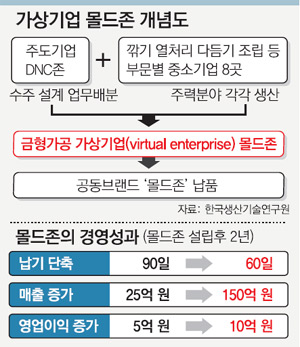 생산된 제품은 몰드존이라는 통합브랜드로 팔리지만 실제 몰드존이라는 회사는 없다. 공정별로 전문화된 기업이 별도 법인으로 존재하면서 그때그때 뭉쳐 일한다는 점에서 ‘가상 기업’인 셈이다.