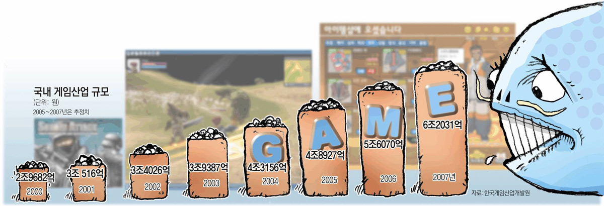 ‘왕의 남자’는 얼마 후면 극장에서 막을 내리지만 리니지는 다르다. 지금도 1인당 월 3만 원가량의 게임 사용료가 매출로 계속 쌓이고 있다. 게임 산업은 ‘황금 알을 낳는 거위’에 비유된다. 더는 100원짜리 동전이나 긁어모으는 동네 전자오락실의 게임이 아니다. 대기업들도 관심이 많다.