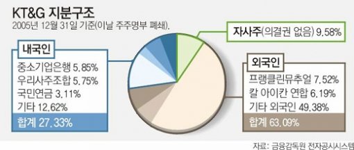 하지만 KT&G 사태가 커지면서 정부의 입장이 선회할 조짐도 나타나고는 있다. “KT&G 건은 시장이 잘 돌아가고 있다는 증거”라던 강철규(姜哲圭) 공정거래위원장은 7일 라디오에 출연해 “기간산업이나 한국을 대표하는 기업의 경영권을 외국자본이 빼앗아 가려는 데 대해서는 별도의 대책이 필요하다”고 말했다.