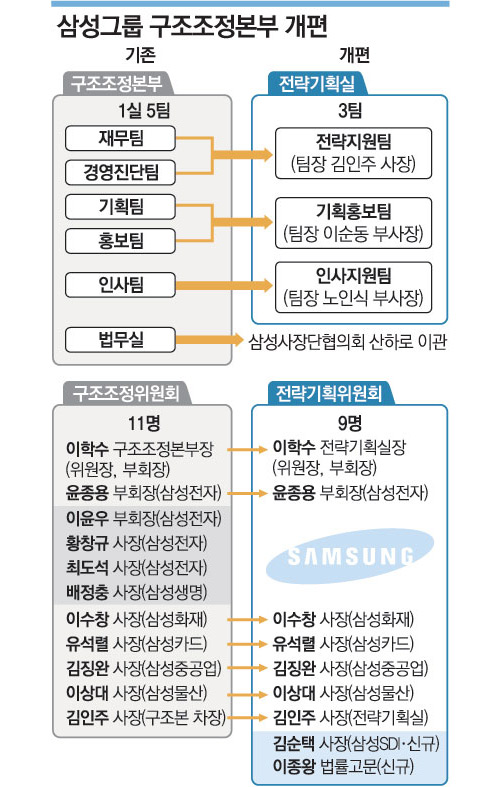 삼성은 구조본 개편에 맞춰 삼성구조조정위원회의 명칭을 전략기획위원회로 바꿨다. 위원 수도 2명 줄였다. 기존 위원 중 이윤우 부회장과 황창규 최도석(이상 삼성전자) 사장, 배정충(삼성생명) 사장을 빼고 김순택(삼성SDI) 사장, 이종왕(전 법무실장) 고문을 새로 선임했다.