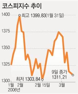 이날 코스피지수는 전날보다 2.84포인트(0.22%) 하락한 1,311.21로 장을 마쳤다. 국제유가 하락과 미국 증시 상승 소식으로 한때 1,320 선까지 올랐지만 마감 직전 프로그램 매도가 몰리면서 급격히 하락하는 모습을 보였다.