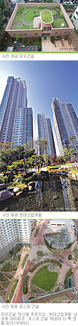 주택상품개발팀 양동기 팀장은 “옥상 녹화의 결과 실제 나비와 벌이 날아들고 있다”며 “아파트 미관의 자연스러움과 아름다움 외에도 여름철에는 햇볕을 막아 주고, 겨울에는 내부 온도를 유지하는 효과가 있다”고 말했다. 최근 모델하우스를 공개한 서울 강남구 삼성동 현대아파트에도 에코 디자인이 강화됐다. 아파트 동과 부속 동에 옥상정원을, 자연채광을 위해 움푹 들어간 ‘성큰(Sunken)부’에는 정원을 배치했다. 콘크리트 색으로 삭막한 느낌을 주던 아파트 벽면도 바뀌고 있다. 올해 말 분양 예정인 대구 달서구 월성동 ‘아이파크’는 ‘담쟁이 디자인’을 선택했다. 현대산업개발 상품개발본부 조용호 조경설계파트장은 “위로 자라는 담쟁이, 아래로 성장하는 인동덩굴과 줄 사철을 이용해 그린(Green)으로 바꾸는 게 요즘 벽면 디자인의 추세”라고 밝혔다.