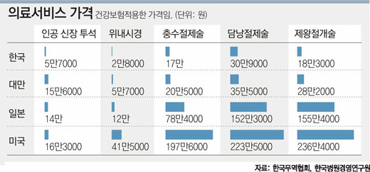 실제로 담낭절제술은 한국이 30만9000원인데 비해 미국은 223만5000원, 일본은 152만3000원에 이른다.